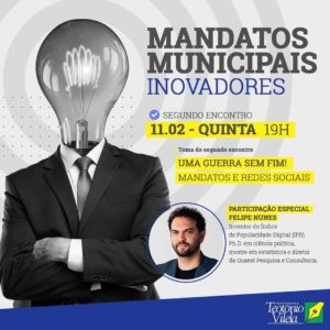 O segundo encontro vai tratar do uso das redes sociais nos mandatos e terá a participação de Felipe Nunes, PhD em ciência polÃtica e criador do Ãndice de Popularidade Digital (IPD).